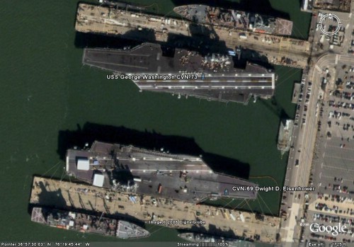 其他的美国航母目前还没有找到,为了便于大家浏览,我花了一晚上制作了KMZ格式的Google Earth地标文件,在“Google Earth观察”栏目中的“美国航空母舰”一文中提供了下载链接,下载文件后可以直接浏览定位到相关航空母舰的位置。